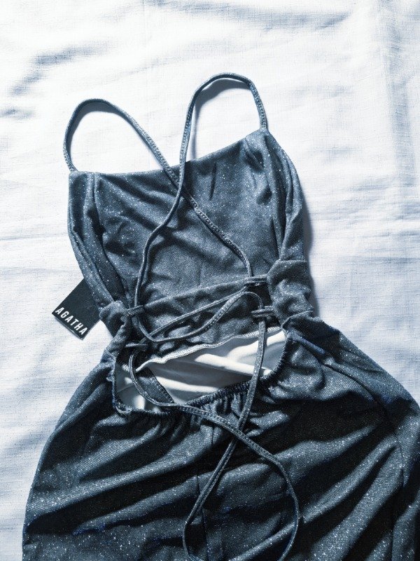 Vestido de glitter tornasolado azul. Abierto al costado. Espalda y breteles regulables