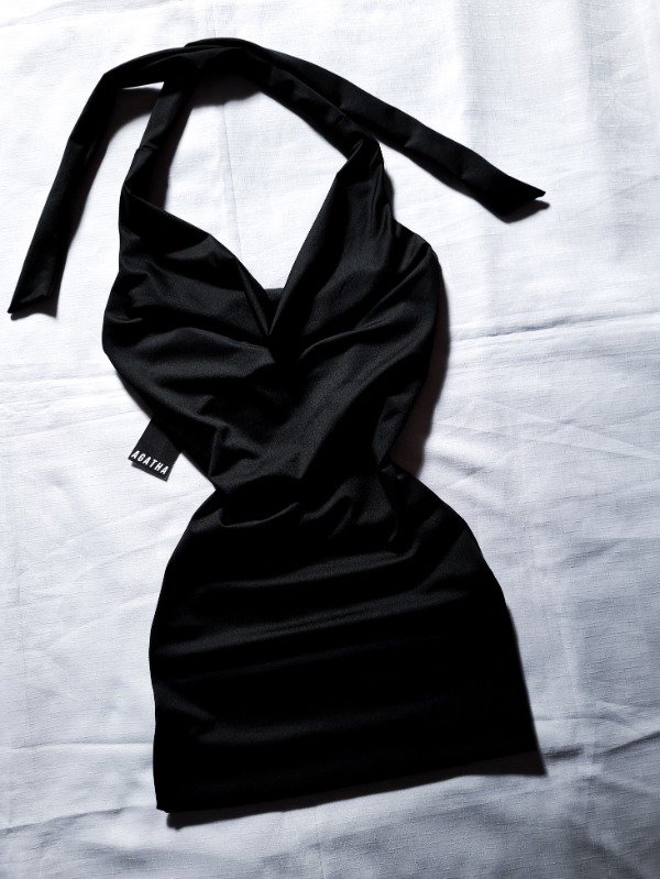 Vestido de microfibra escote buche para atar en cuello. Espalda descubierta. Va para talles 34/36/38